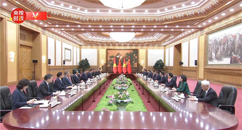 習(xí)近平指出,很高興再次與范明政總理會面。歡迎你來華出席夏季達(dá)沃斯論壇。去年年底我訪問越南期間,同阮富仲總書記一道宣布構(gòu)建具有戰(zhàn)略意義的中越命運(yùn)共同體,引領(lǐng)兩國關(guān)系進(jìn)入新階段。半年多來,兩黨兩國高層交往密切,各領(lǐng)域合作進(jìn)展順利,中越命運(yùn)共同體建設(shè)開局良好,給兩國人民帶來實(shí)實(shí)在在的利益,我們對此深感高興。