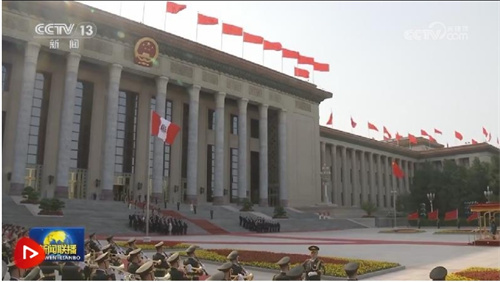 博魯阿爾特抵達時,禮兵列隊致敬。兩國元首登上檢閱臺,軍樂團奏中秘兩國國歌,天安門廣場鳴放21響禮炮。博魯阿爾特在習(xí)近平陪同下檢閱中國人民解放軍儀仗隊,并觀看分列式。