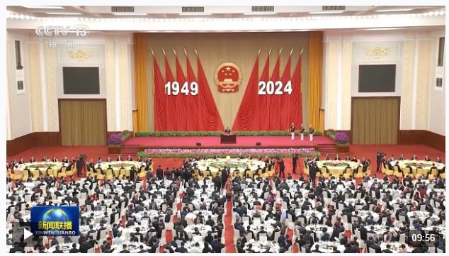 人民大會堂宴會廳華燈璀璨,洋溢著喜慶熱烈的節(jié)日氛圍。主席臺上方高懸著莊嚴(yán)的國徽,“1949-2024”大字年號在鮮艷紅旗映襯下格外醒目。