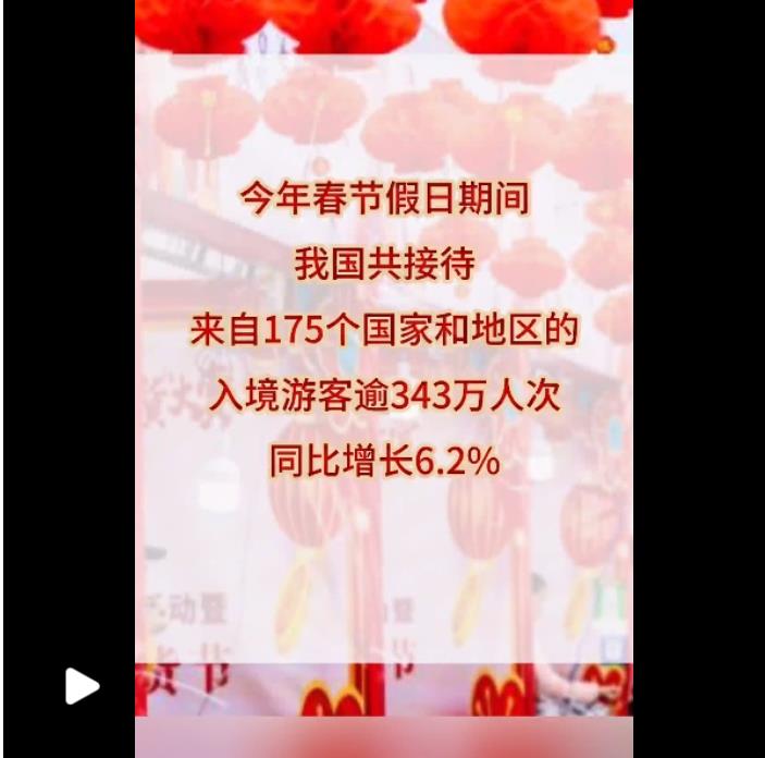 首個(gè)“非遺版”春節(jié),普天同慶,五洲同春。“來(lái)華體驗(yàn)中國(guó)年”,是其中一道動(dòng)人的風(fēng)景。中國(guó)的高鐵上、景區(qū)里,時(shí)?梢娡鈬(guó)游客的身影。數(shù)據(jù)顯示,今年春節(jié)假日期間,我國(guó)共接待來(lái)自175個(gè)國(guó)家和地區(qū)的入境游客逾343萬(wàn)人次,同比增長(zhǎng)6.2%。