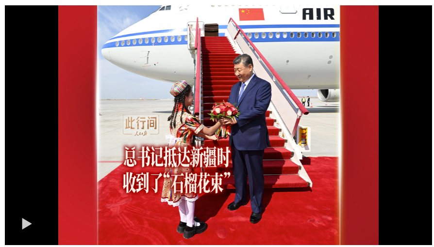 習近平率中央代表團23日下午乘專機抵達烏魯木齊,出席新疆維吾爾自治區(qū)成立70周年慶祝活動,新疆各族群眾在機場熱烈歡迎。總書記收到的花束里,裝點了美麗的石榴。如今,“石榴籽”的妙喻為人熟知,民族團結(jié)觀念深入人心。