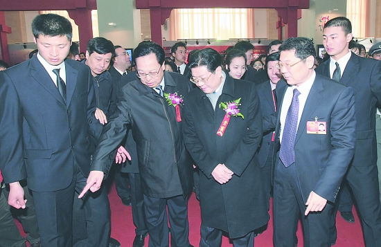 3月2日上午,中共中央政治局委員、全國(guó)人大常委會(huì)副委員長(zhǎng)、中華全國(guó)總工會(huì)主席王兆國(guó)(前左三)在省委書(shū)記、省人大常委會(huì)主任徐光春(前左二),市委書(shū)記路國(guó)賢(前左四)等的陪同下到焦作展廳視察。