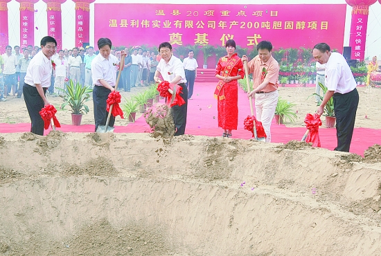 圖 昨日上午,市領導路國賢、王太峰、田躍曾、張建設為溫縣利偉實業(yè)有限公司年產200噸膽固醇項目奠基。本報記者 趙耀東 攝