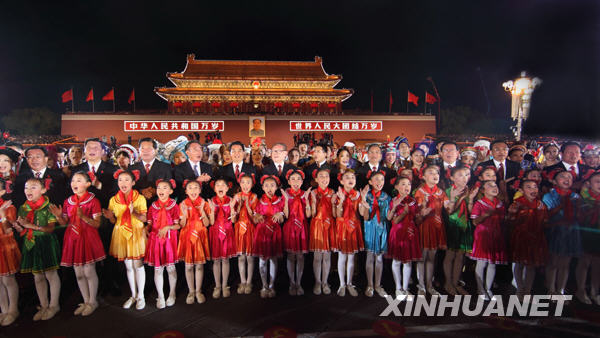 10月1日晚,首都各界群眾在北京天安門(mén)廣場(chǎng)舉行盛大聯(lián)歡晚會(huì),熱烈慶祝中華人民共和國(guó)成立60周年。黨和國(guó)家領(lǐng)導(dǎo)人胡錦濤、江澤民、吳邦國(guó)、溫家寶、賈慶林、李長(zhǎng)春、習(xí)近平、李克強(qiáng)、賀國(guó)強(qiáng)、周永康等同各界群眾共同歡度國(guó)慶之夜。新華社發(fā)