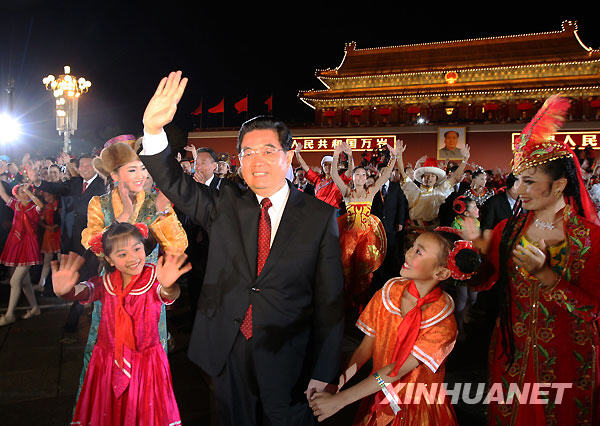 10月1日,首都各界慶祝中華人民共和國(guó)成立60周年聯(lián)歡晚會(huì)在北京天安門(mén)廣場(chǎng)舉行。這是中共中央總書(shū)記、國(guó)家主席、中央軍委主席胡錦濤走出天安門(mén)城樓,來(lái)到群眾中間。新華社記者 蘭紅光 攝