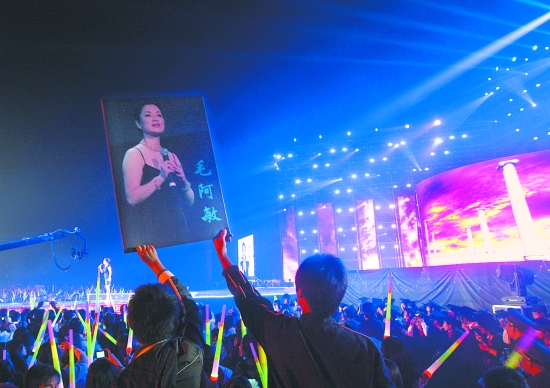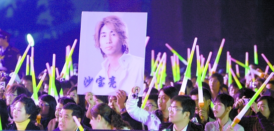 | ↑河南理工大學(xué)師生將著名歌星沙寶亮的照片高高舉起。 本報(bào)記者 劉 璐 攝 |