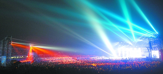 昨晚,《歡樂中國行·魅力太行》大型文藝晚會(huì)在河南理工大學(xué)南校區(qū)新體育場(chǎng)隆重舉行。圖為晚會(huì)現(xiàn)場(chǎng)。 本報(bào)記者 趙耀東 攝 | |