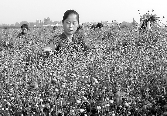 圖③ 連日來,溫縣農(nóng)科所懷菊無公害生產(chǎn)基地400畝珍珠菊進(jìn)入收獲期,農(nóng)民趁晴好天氣抓緊采收。近年來,該縣開發(fā)的珍珠菊種植面積逐年擴(kuò)大,經(jīng)標(biāo)準(zhǔn)化種植的無公害產(chǎn)品俏銷我國北京、香港及新加坡等國內(nèi)外市場,藥農(nóng)每年畝均增收2000元以上! 徐宏星 攝