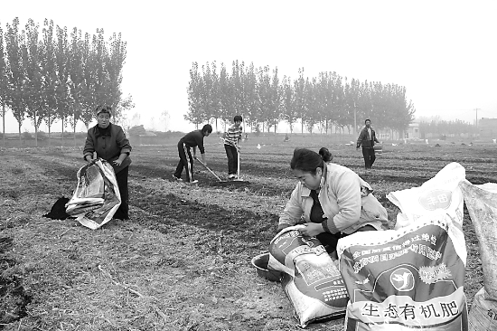 圖② 10月15日,按照農(nóng)技人員的指導(dǎo),修武縣高村鄉(xiāng)東黃村村民在田間普施底肥。連日來,該縣農(nóng)業(yè)局組織50名農(nóng)技人員深入田間地頭,推廣生態(tài)有機(jī)肥應(yīng)用技術(shù),指導(dǎo)農(nóng)民科學(xué)施肥! 趙 奎 攝