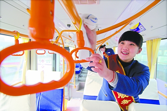 12月24日上午,焦鄭城際公交乘務(wù)員尚銀晶身著一身藍(lán)色工裝,正在認(rèn)真擦洗車窗。記者注意到,乘務(wù)員的這身衣服和飛機(jī)上空姐的著裝非常相似。