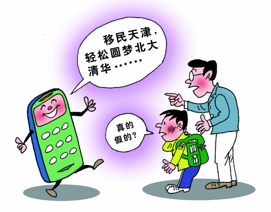 “移民天津,輕松圓夢北大清華,置業(yè)天津拿藍(lán)印戶口,享一本升學(xué)率89%!”日前,我市一房產(chǎn)代理機(jī)構(gòu)發(fā)布的這一廣告短信引起了廣大市民的關(guān)注。
