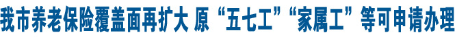 日前,省人力資源和社會(huì)保障廳下發(fā)《關(guān)于將原“五七工”“家屬工”等人員納入城鎮(zhèn)企業(yè)職工基本養(yǎng)老保險(xiǎn)統(tǒng)籌范圍的通知》(以下簡(jiǎn)稱《通知》),將這一部分人員納入了基本養(yǎng)老保險(xiǎn)統(tǒng)籌范圍。從今天起,他們便可按照規(guī)定申辦養(yǎng)老保險(xiǎn)。