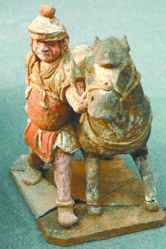 蒙古人馭馬俑為國家一級文物,俑高29.4厘米,馬高27厘米,底座長23厘米,寬16.3厘米。靳煌墓出土的80件陶俑造型生動、形象逼真、神態(tài)各異、栩栩如生,歷經(jīng)700余年,出土?xí)r依然色澤艷麗,保存比較完整。
