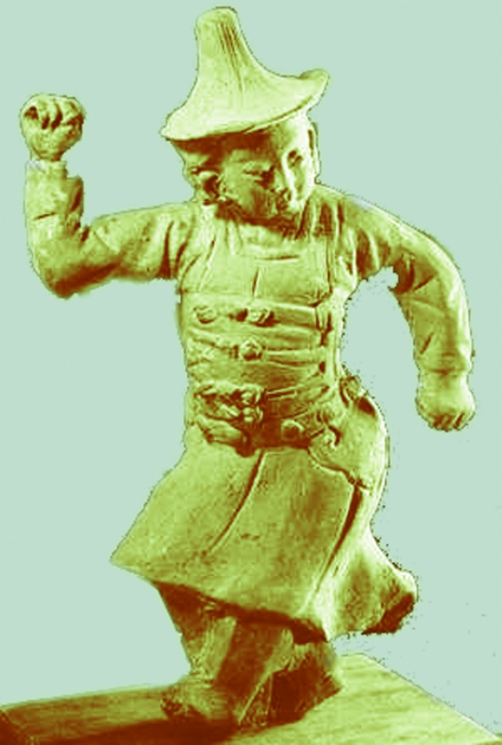 拼圖左為元代彩繪蒙古人馭馬俑,右為元代雜劇舞蹈磚俑。 (本報資料圖片)