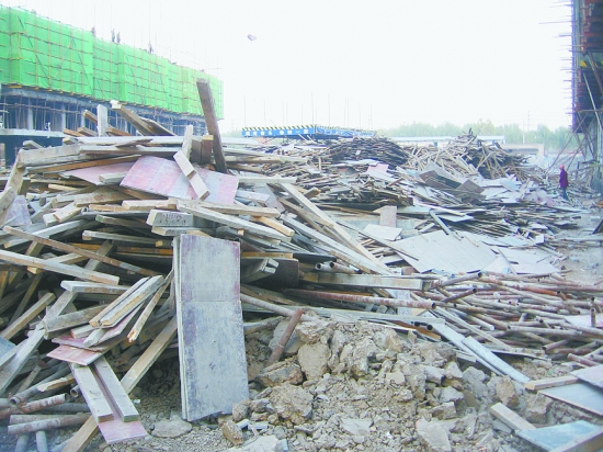 11月19日下午,沿著龍源湖國際廣場二期工程正對大門口的一條東西方向道路進入工地后,在第一個十字路口向北拐,眼前呈現(xiàn)出一片混亂的景象:各種鋼管、三合板、木料等材料,橫七豎八地堆放在兩棟樓之間的路面上。其中一個警示牌西側(cè)的兩棟樓之間被凌亂的木板、鋼管塞得“水泄不通”,施工人員要么繞行,要么踩著木板堆才能到達西圍墻處的生活區(qū)。