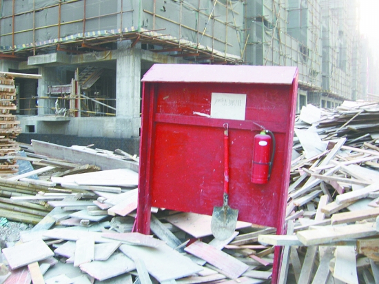 按照這位施工人員的提醒,記者看到,在“文明施工”警示牌西南側(cè)4米,有一個木質(zhì)報刊亭狀的消防設(shè)備存放點,偌大的存放點僅放著一把消防鐵鍬和一個干粉滅火器,而該消防設(shè)備存放點的四周卻橫七豎八堆放著木料、鋼管等物。