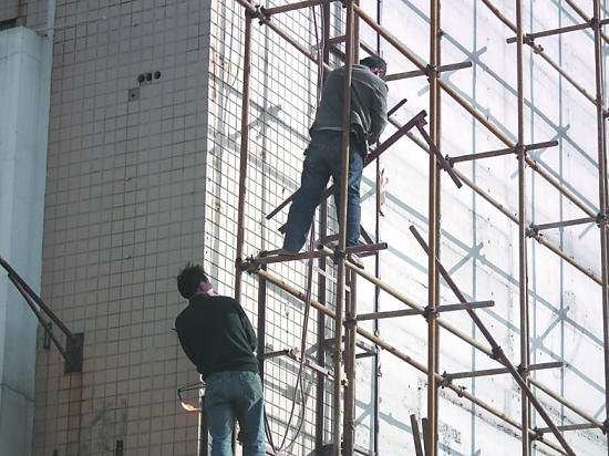 昨日下午,在大楊樹商業(yè)街同一首歌KTV裝修工地現(xiàn)場,2名施工人員在沒有任何防護設(shè)施的情況下,站在離地面約5米高的鋼管架上,拿著電焊切割原來的廣告架,產(chǎn)生的火花直接落在了地面上零落的木版、紙屑上……