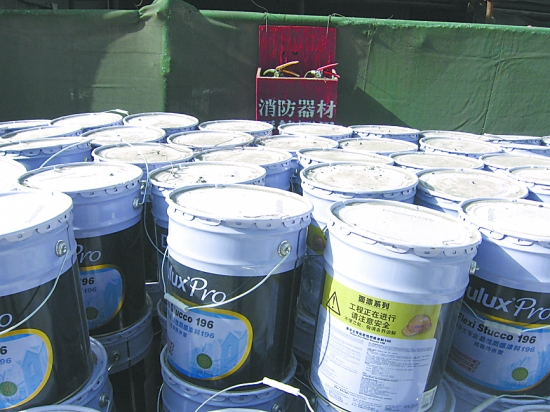 據(jù)了解,這一情況在市區(qū)其他在建工地也很多見。如建業(yè)森林半島三期工程建筑工地的一個消防設(shè)備存放點,就被桶裝的墻壁涂料擋在了里面。