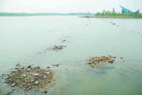 下圖 水位的下降,使當(dāng)初建湖心島時留下的路基露出了水面。