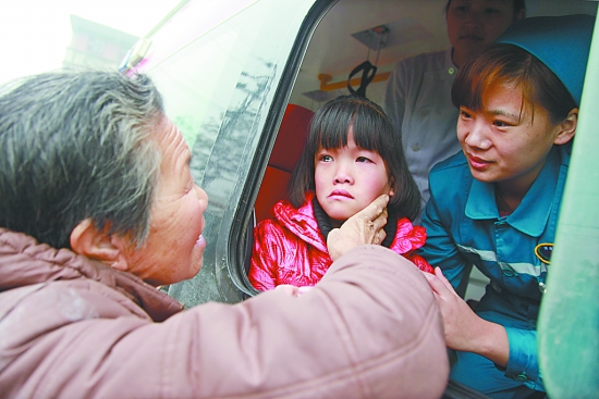 下圖 解放軍第九十一中心醫(yī)院的醫(yī)護(hù)人員趕到學(xué)校接王希成。