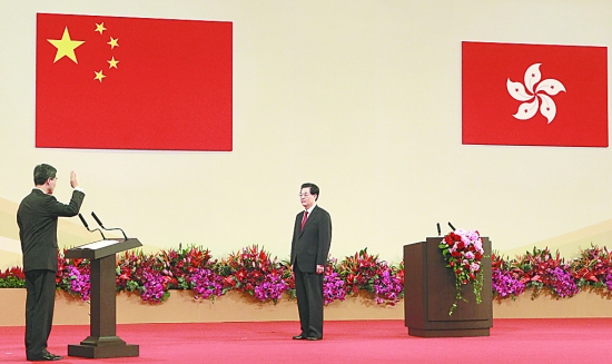 | 7月1日,中共中央總書記、國家主席、中央軍委主席胡錦濤出席慶祝香港回歸祖國15周年大會(huì)暨香港特別行政區(qū)第四屆政府就職典禮。這是由胡錦濤監(jiān)誓,香港特別行政區(qū)第四任行政長官梁振英宣誓就職。 鞠 鵬 攝。ㄐ氯A社發(fā)) |