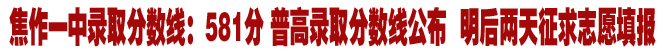 據(jù)了解,今年我市部分省、市級普通高中普通統(tǒng)招生錄取分?jǐn)?shù)線分別為:焦作一中581分、焦作十一中541分,焦作外國語中學(xué)480分,焦作十二中491分,焦作四中472分,修武一中566.5分,博愛一中557.5分,武陟一中571分,沁陽一中567.5分,溫縣一中565.5分,孟州一中527.5分。