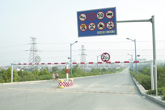 | 圖為塔北路影視路口設置的限高門,“身高”超過2.5米的車輛,須自行繞路。 本報記者 馮新瑞 攝 |