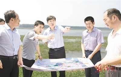 昨日上午,市委書記王小平在大沙河靈泉湖段檢查防汛工作。