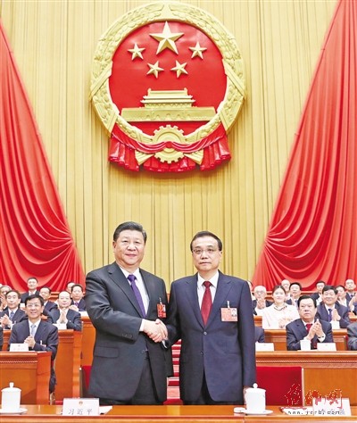 3月18日,十三屆全國人大一次會議在北京人民大會堂舉行第六次全體會議。根據(jù)國家主席習近平的提名,經(jīng)過投票表決,決定李克強為中華人民共和國國務院總理。這是習近平同李克強親切握手。 新華社記者 鞠 鵬 攝(新華社發(fā))