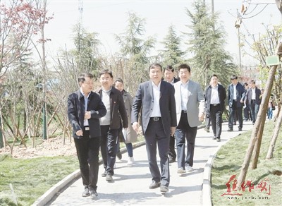 昨日,市委書記王小平等領(lǐng)導(dǎo)在孟州市北環(huán)路觀摩綠色廊道建設(shè)情況。記者 劉 璐 攝