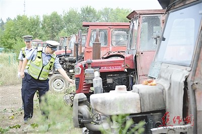 民警檢查暫扣的載貨拖拉機(jī)。 記者 翟鵬程 攝