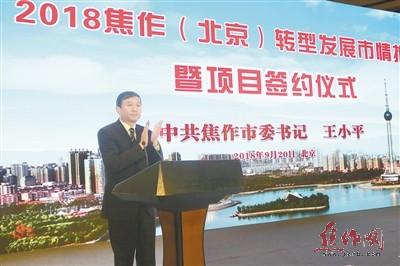 昨日,市委書記王小平在2018焦作(北京)轉(zhuǎn)型發(fā)展市情推介暨項(xiàng)目簽約儀式上致辭。 特派記者 趙耀東 攝