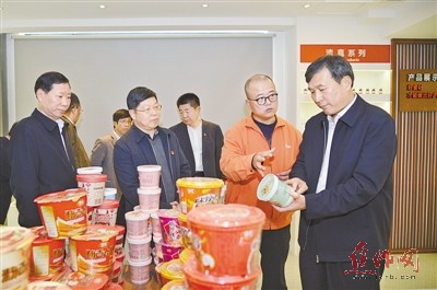 上圖 昨日,市委書(shū)記、市人大常委會(huì)主任王小平等領(lǐng)導(dǎo)在河南京華食品科技開(kāi)發(fā)有限公司調(diào)研鄉(xiāng)村振興龍頭企業(yè)產(chǎn)品研發(fā)情況。 記者 翟鵬程 攝