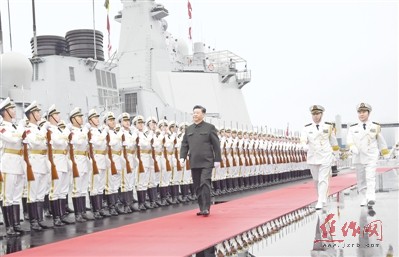 4月23日,在中國人民解放軍海軍70華誕之際,中共中央總書記、國家主席、中央軍委主席習近平出席在青島舉行的慶祝人民海軍成立70周年海上閱兵活動。圖為習近平檢閱海軍儀仗隊。