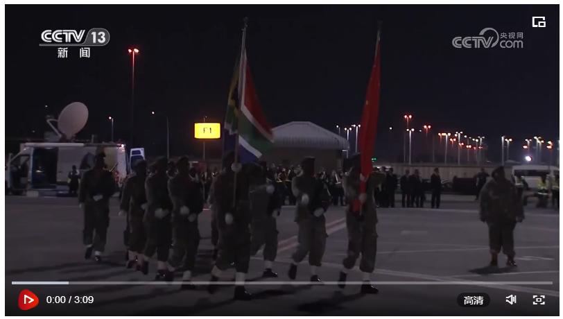 晚11時許,習(xí)近平乘坐的專機抵達約翰內(nèi)斯堡坦博國際機場。南非總統(tǒng)拉馬福薩率外長潘多爾,陪同部長、總統(tǒng)府婦女、青年部長祖馬等政府高級官員在舷梯旁熱情迎接。南非婦女向習(xí)近平獻上鮮花,禮兵持槍致敬。身著民族服裝的民眾跳起奔放的舞蹈。