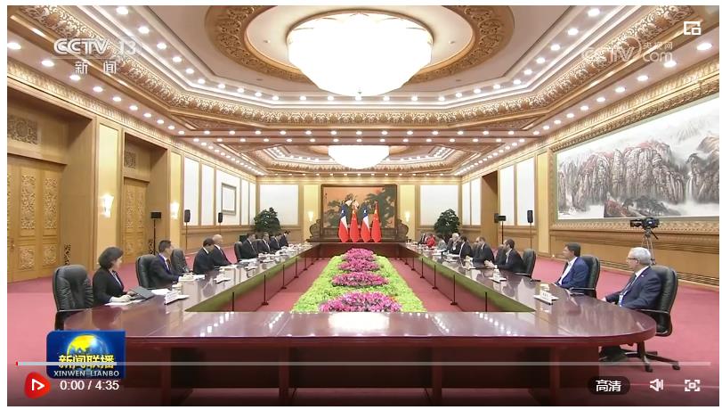 10月17日上午,國家主席習(xí)近平在人民大會堂同來華出席第三屆“一帶一路”國際合作高峰論壇并進行國事訪問的智利總統(tǒng)博里奇舉行會談。