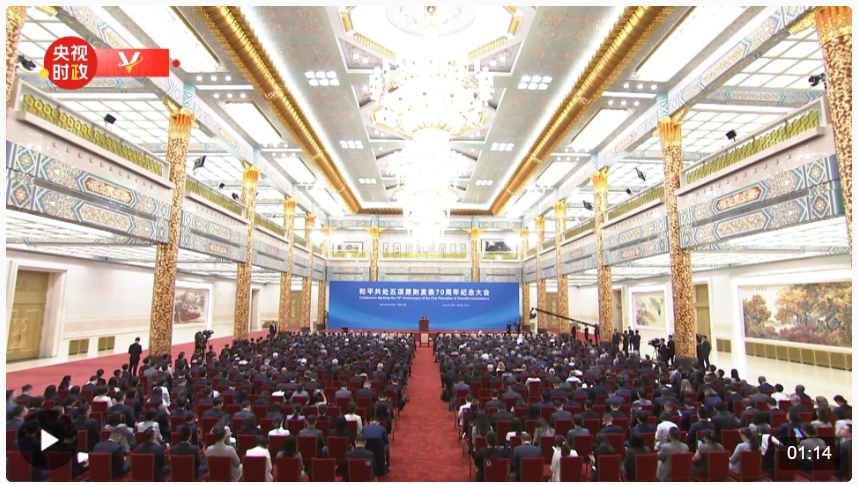 6月28日上午,和平共處五項(xiàng)原則發(fā)表70周年紀(jì)念大會(huì)在北京人民大會(huì)堂隆重舉行。國(guó)家主席習(xí)近平出席紀(jì)念大會(huì)并發(fā)表題為《弘揚(yáng)和平共處五項(xiàng)原則,攜手構(gòu)建人類命運(yùn)共同體》的重要講話。
