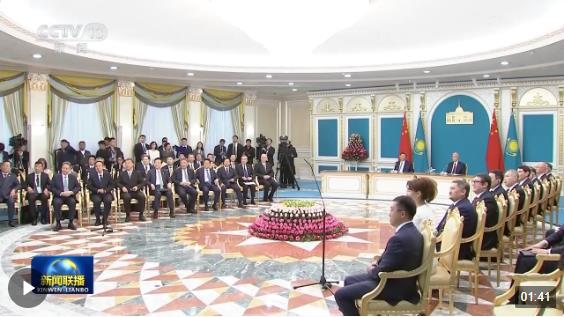 習(xí)近平和托卡耶夫觀看中歐跨里海直達(dá)快運(yùn)項(xiàng)目視頻。哈方項(xiàng)目負(fù)責(zé)人向兩國(guó)元首匯報(bào)準(zhǔn)備情況,中方項(xiàng)目負(fù)責(zé)人請(qǐng)兩國(guó)元首下達(dá)指令。