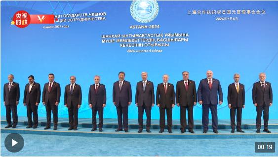 當?shù)貢r間7月4日上午,國家主席習近平在阿斯塔納獨立宮出席上海合作組織成員國元首理事會第二十四次會議。習近平同上海合作組織成員國領導人集體合影。