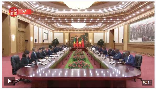 會談前,習(xí)近平和夫人彭麗媛在人民大會堂北大廳為薩蘇和夫人安托瓦內(nèi)特舉行歡迎儀式。