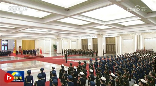 天安門廣場鳴放21響禮炮,禮兵列隊致敬。兩國元首登上檢閱臺,軍樂團奏中吉兩國國歌。扎帕羅夫在習近平陪同下檢閱中國人民解放軍儀仗隊,并觀看分列式。