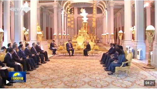 4月17日下午,柬埔寨國王西哈莫尼同中國國家主席習(xí)近平在金邊王宮舉行會(huì)見。