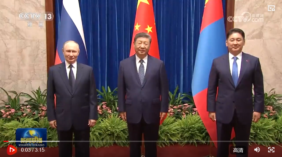 9月2日上午,國家主席習近平同俄羅斯總統(tǒng)普京、蒙古國總統(tǒng)呼日勒蘇赫在北京人民大會堂舉行中俄蒙三國元首第七次會晤。