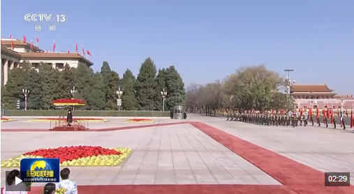 哇集拉隆功抵達時,禮兵列隊致敬。習(xí)近平同哇集拉隆功登上檢閱臺,軍樂團奏中國國歌和泰國頌圣歌,天安門廣場鳴放禮炮21響。哇集拉隆功在習(xí)近平陪同下檢閱中國人民解放軍儀仗隊,并觀看分列式。