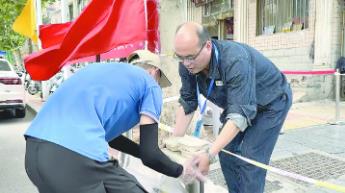 軒成餐配工作人員(左)為考務(wù)人員分發(fā)套餐。