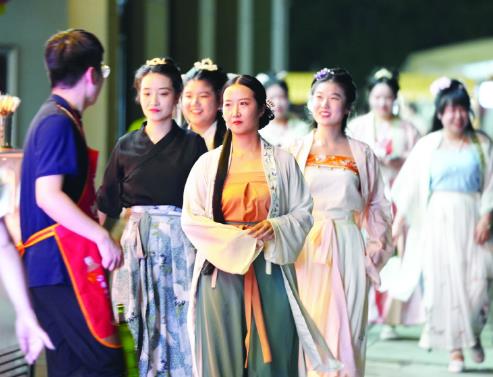 在該市快活林文旅小鎮(zhèn)等處,夜市現(xiàn)場還進行了優(yōu)秀傳統(tǒng)文化展演,演員們身穿漢服與游客一道游玩,學生們表演了經(jīng)典的古詩詞朗誦,還進行了大鼓、舞龍、模特走秀、空竹、扇子舞、戲曲《韓愈家風賦》等文藝節(jié)目表演,競技類游戲趣味投壺等更讓游客參與其中、樂在其中。