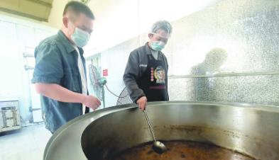 楊偉(左)在加工間了解生產(chǎn)情況。