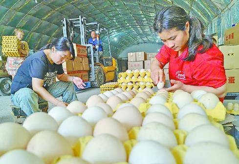 9月10日,武陟縣小董鄉(xiāng)磨莊村鴻益農(nóng)牧專業(yè)合作社,社員在打包雞蛋。該合作社現(xiàn)有飼養(yǎng)大棚40座,蛋雞存欄量達(dá)30萬(wàn)只,平均日產(chǎn)蛋12噸,年收益達(dá)200萬(wàn)元,為本村及周邊村民提供了50余個(gè)就業(yè)崗位。