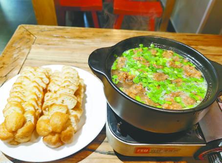 麻燙要提前炸,使用小麥面粉,七成用老酵發(fā)面,三成用熱水燙面,將發(fā)好的面團(tuán)與燙面混合、攪勻、揉筋,用植物油炸至金黃出鍋。食用時,先把牛肉丸入鍋加老湯煮熟,最后加以香菜等,麻燙切小塊分碗備用,食客來了拿起裝了麻燙的碗,用滾湯把麻燙泡透,湯鮮味厚,吃起來香噴噴的更解饞。