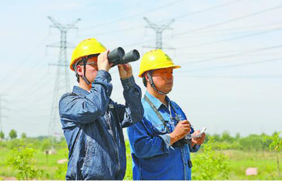 手拿“武器”——望遠(yuǎn)鏡、照相機(jī)、測(cè)距儀、無(wú)人機(jī)等作業(yè)工具,穿越田間地頭、山川河流,攀爬在高聳的輸電鐵塔上……該班成員一年中有300天以上都要在戶(hù)外工作,盡全力保障著高壓輸電線(xiàn)路的本體和通道安全。寒來(lái)暑往,他們總是身著一身規(guī)整的藍(lán)色全棉工作裝、一雙絕緣鞋再配一頂安全帽。